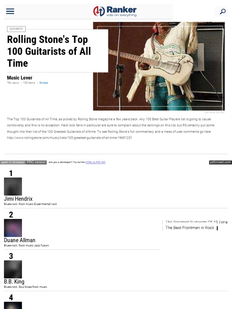 Rolling Stone 100 Greatest Guitarists Of All Time / Useful Notes TV Rolling Stones Top 100 Guitarists list your movie, tv & celebrity picks. playlist · rolling stone's 100 greatest guitarists of all time · 191 items · 33.6k likes. Widely regarded as the greatest and most influential guitarist in rock history,. these guitarists and artists ranked their favorites and helped explain why these guitar players made it to the top 100 list. . Rolling Stones Top 100 Guitarists.